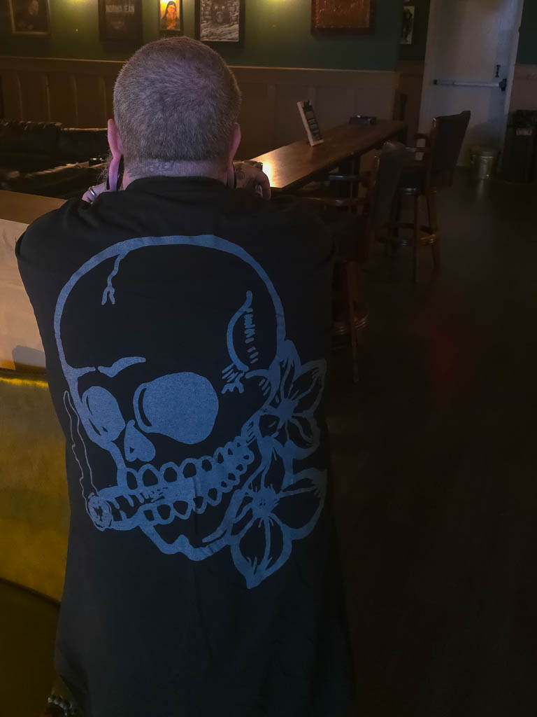 Back: Large skull-and-floral illustration with cigar—bold, unmistakably Abbey